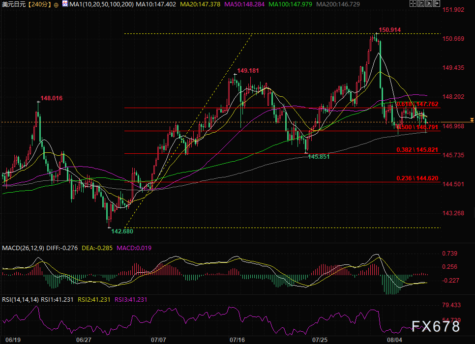 同时周四(8月7日)因《朝日新闻》援引白宫官员消息——美国总统特朗普可能对已有超15%关税的产品不适用豁免的情况下对所有日本进口商品额外征收15%对等关税; 叠加日本央行加息时机的不确定性,以及市场普遍积极的风险情绪,共同削弱了避险日元的吸引力。这一局面还需置于日本近期的政治经济背景中审视。 执政的自民党在7月20日上议院选举中失利,反对派呼吁增加支出和减税,引发了市场对日本财政健康的担忧;而周三发布的数据显示,日本6月实际工资连续第六个月下降,进一步加剧了对消费主导型复苏的忧虑——这些因素都暗示日本央行加息前景可能推迟,对日元形成压制。 不过,日本央行一再表态,若经济增长和通胀符合预期,今年年底前仍有进一步加息的可能,这让日元看空者不敢贸然行动,也为美元兑日元提供了一定支撑。 汇价走势的另一面,来自美元的波动与美联储的政策预期。美元从周三触及的一周多低点小幅回升,推动美元兑日元汇率在过去一小时回升至147.00中期水平上方。 但美元的反弹空间或受限制:美元指数周三跌至一周低点,因市场预期美联储今年降息次数将超此前预期;7月美国非农就业报告显示劳动力市场状况显著恶化,周二发布的美国ISM服务业PMI数据也凸显了特朗普不稳定贸易政策对经济的持续拖累,这均强化了市场对美联储9月恢复降息周期的预期(预计年底至少降息两次,每次25个基点),进而对美国国债收益率和美元形成压力。 日本央行与美联储的政策前景分化,则为日元提供了支撑。市场普遍预期美联储将在9月降低借贷成本而降息,而日本央行的加息可能性存在不确定性却未完全消退,这种分化提醒看空日元的交易者保持谨慎,也使得在美元兑日元出现足以逆转的重大利好前,需要等待空方动能慢慢衰竭。 从技术面看,本周美元兑日元从4小时图中的200均线(约146.60区域,即周低点)开启反弹及后续上涨,对多头构成利好。 但图表上的振荡指标尚未确认看涨前景,且价格至今难以突破7月月度低点上涨的38.2%斐波那契回撤位,因此在价格持续突破147.80-147.85区域前,保持谨慎仍属必要。 若突破该区域,汇率可能站上148.00整数关口,进一步攀升至148.45-148.50区域,甚至延伸至149.00附近(23.6%斐波那契回撤位);反之,亚洲交易时段低点(约147.15区域)及147.00关口构成即时支撑,随后是146.75的密集交易区(4小时图200SMA与50%斐波那契回撤位),若该点位被果断跌破,可能打开更深跌势,汇价或加速测试146.00以下水平(61.8%斐波那契回撤位),甚至触碰145.00心理关口。 短期来看,交易者需重点关注北美交易时段晚些时候发布的美国每周初请失业金数据,以及联邦公开市场委员会(FOMC)成员的讲话——这些因素与贸易相关头条新闻一起,将共同影响美元兑日元的短期走势。