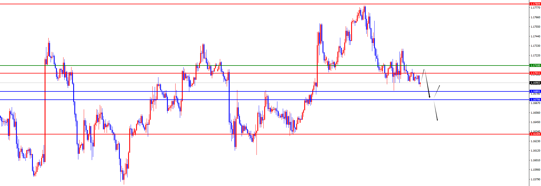 美指97.60-70区间多继续持有,防守5美金,目标98.20-98.40-98.60 欧美 欧美方面,周三欧美价格总体呈现下跌的状态。当日价格最低下跌至1.1682位置,最高上涨至1.1729位置,收盘于1.1693位置。回顾周三欧美市场表现,在早盘期间价格先承压下跌,之后再度向上测试我们昨日强调空的位置,隔夜期间价格持续承压,最终当天大阴状态收尾。后续继续关注日线及周线区间支撑得失 从多周期分析,从月线级别来看,欧美受撑于1.1060位置,所以价格在此位置之上长线多头对待。从周线级别看价格受撑于1.1670区域的支撑,此位置是中线走势的多空分水岭,目前关注此位置得失。从日线级别,随着时间的推移目前日线阻力于1.1680位置,此位置作为波段走势的关键分水岭,目前继续关注此位置得失,短线操作上需要按照四小时及一小时为主。同时按照四小时级别看,随着时间的推移昨日价格如期承压于四小时阻力,目前持续承压中,目前四小时阻力于1.1700-10区间,短线以此位置看承压,下方关注日线及周线支撑得失。