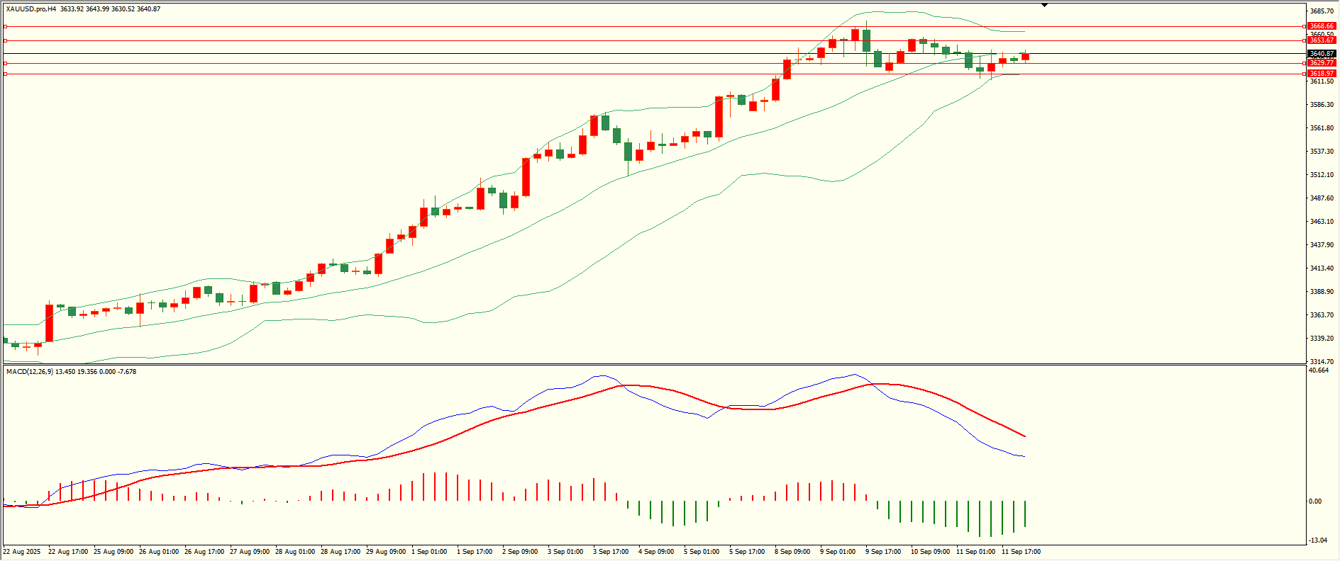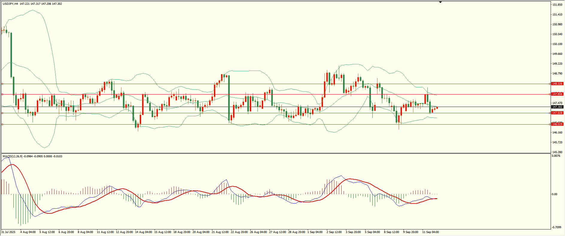 美日昨日反弹至第一阻力上方冲高回落,尾盘时段触及第一支撑小幅反弹,日线报收小阴线,总体来看,日线的多空震荡格局保持,从4H来看,布林中轨偏下,MACD零轴下方运行,日内下方首要支撑147.00,第二支撑146.50,上方阻力147.85,148.30,保持在第一支撑上方短线有望回测第一阻力。 黄金:XAUUSD