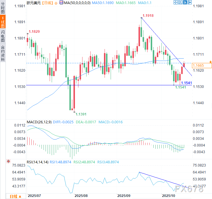 鸽派鲍威尔遏止美元反弹势头 近三个交易日欧元兑美元强势反弹,正值美联储主席杰罗姆·鲍威尔本周稍早在全美商业经济协会活动上发表讲话。鲍威尔持续警示美国劳动力市场面临的下行风险,此举未能削弱市场对本月再次降息几乎已成定局的预期定价。 鲍威尔表示:“尽管8月份失业率仍维持在低位,但新增就业岗位已急剧放缓,部分原因可能是移民和劳动参与率下降导致的劳动力增长放缓。在这个活力减弱且略显疲软的劳动力市场中,就业面临的下行风险似乎已经上升。” 鲍威尔的讲话虽未显著改变市场对联邦基金利率的近期预期,但确实压低了期限更长的国债收益率,令对政策敏感的两年期收益率跌至5月以来未见之水平。 尽管从一周至一个月的时间跨度来看,欧元兑美元与美债绝对收益率或欧美利差近期并未呈现持续关联,但难以忽视的是,自鲍威尔发表关于“可能很快暂停量化紧缩”的讲话后,美元持续遭遇抛售。这很可能助推了欧元兑美元的反弹——尽管欧元区经济数据相对于预期始终表现平平。 尽管有欧洲央行行长拉加德等多位官员即将发表讲话,但欧元区经济数据相对清淡,包括鲜少出现意外的9月通胀终值。美国方面,由于政府停摆持续,可交易的经济信号稀缺,这意味着美联储官员讲话最可能成为基本面催化剂。 技术展望 观察欧元兑美元日线图,可见汇价在周三已突破9月17日高点以来的下行趋势。此次看涨行情的触发点,是空头未能有效击穿10月9日低点1.1541支撑。 上行方面,近期欧元兑美元与50日移动平均线(1.1690)的关联性较弱,时而交互时而背离。尽管如此,该均线仍是不容忽视的初步阻力位。若能成功突破该均线,则需关注上月末及10月初曾出现卖盘的1.1750上方区域,该位置将成为多头下一关键目标。 下行方面,需重点关注本月早前形成的双底形态低点1.1541支撑位,若有效跌破,或推动汇价短期趋势转向空头主导。 就方向性偏好而言,RSI(14)和MACD指标均呈现中性动能信号,这使得短期价格行为更具参考意义。虽然RSI(14)已突破过去一个月的下行趋势线,但这仅表明看跌动能正在减弱,并未发出明确的看涨信号。